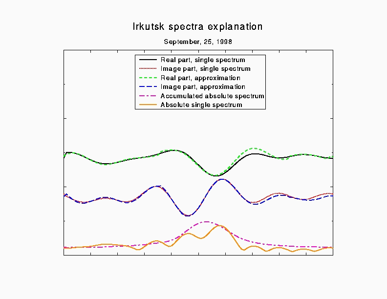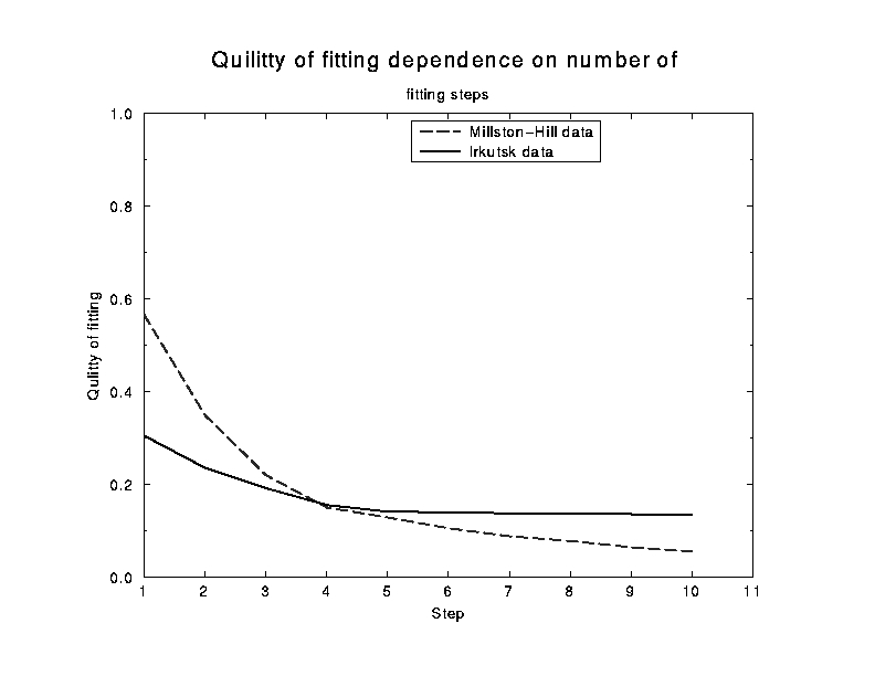 На рис.3. показано обычное качество подгонки (энергетики части спектра, не укладывающейся в предложенную модель), нормированное на мощность исходного спектра. Видно, что эта величина быстро убывает с числом модельных периодических структур, что позволяет надеяться на удачность предложенной модели для описания спектра рассеянного сигнала. Видно, что окончательное качество подгонки (для десяти пространственных гармоник) для данных Милстон-Хилла лучше, чем для Иркутских, что может быть связано в первую очередь, с более высоким отношением сигнал/шум на данных радара Милстон-Хилл.