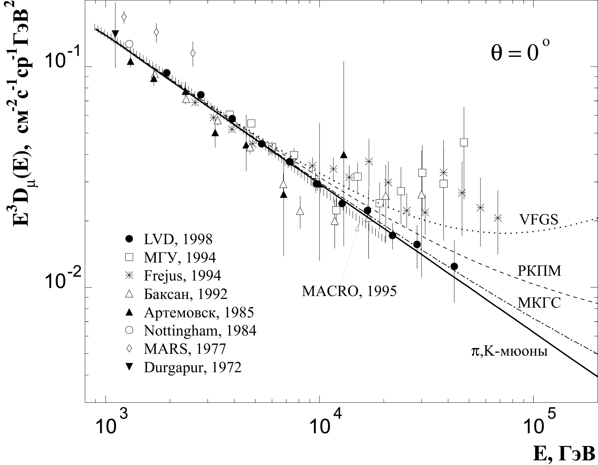 мюонов космических лучей при энергиях выше 1 ТэВ для различных