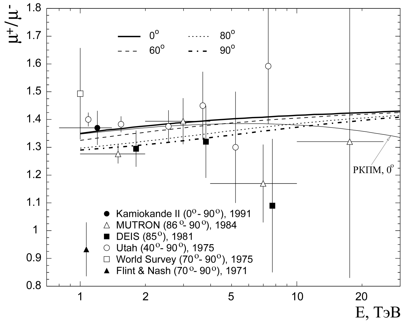 Таким образом, рассчитанные потоки и зарядовое отношение атмосферных мюонов для различных направлений на уровне моря описывают основную совокупность экспериментальных данных и согласуются расчетами других авторов [27, 28]. Это позволяет сделать вывод, что используемые в расчете модели адронного каскада и первичного спектра не противоречат эксперименту.