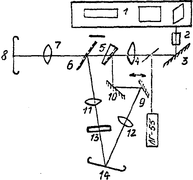 Рис.3. Схема получения голограмм для определения функции пространственной когерентности. 3,5,10 - поворотные зеркала; 4,11,12 - линзы, проектирующие изображение торца лазера вместе с прямоугольной диафрагмой на голограмму и диффузный экран; 6,9 - система подвижных зеркал для выравнивания разности хода объектного и опорного пучков; 7 - линза, проектирующая на пленку 8 распределение интенсивности по торцу лазера; лазер ЛГ-55 служит для юстировки схемы.