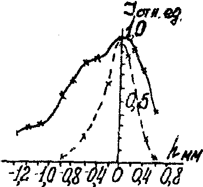 0,05 дж и составлял 1,3х1,3 мм2, при энергии накачки 0,01 дж он резко уменьшался до 0,2 мм2. На рис.4 пунктирной линией показано распределение интенсивности в восстановленном изображении диффузного экрана, которое также является характеристикой когерентности.