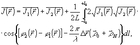где , , - интенсивности, усредненные по времени наблюдения; , - соответственно, модуль и аргумент нормированной функции взаимной когерентности второго порядка, описывающей корреляцию по амплитуде между волновыми полями; - сдвиг по пространственной и временной координатам, соответственно, δ - набег фазы, вызванный разностью оптических путей; может трактоваться как некоторая эффективная разность начальных фаз интерферирующих волновых полей, включающая в себя результат усреднения по диапазо-